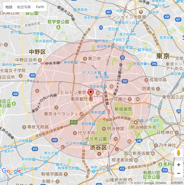 ※画像は、都庁を中心とした3kmの円