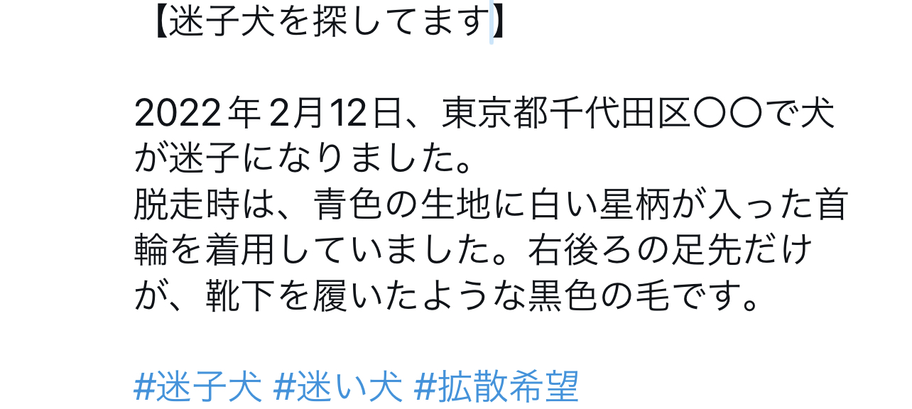 投稿例の最後に書かれている「#迷子犬 #迷い犬 #拡散希望」は「ハッシュタグ」という機能です。 半角のハッシュタグ記号(#)の後に続けてキーワードを入れることで、より効果的に情報拡散をすることができます。